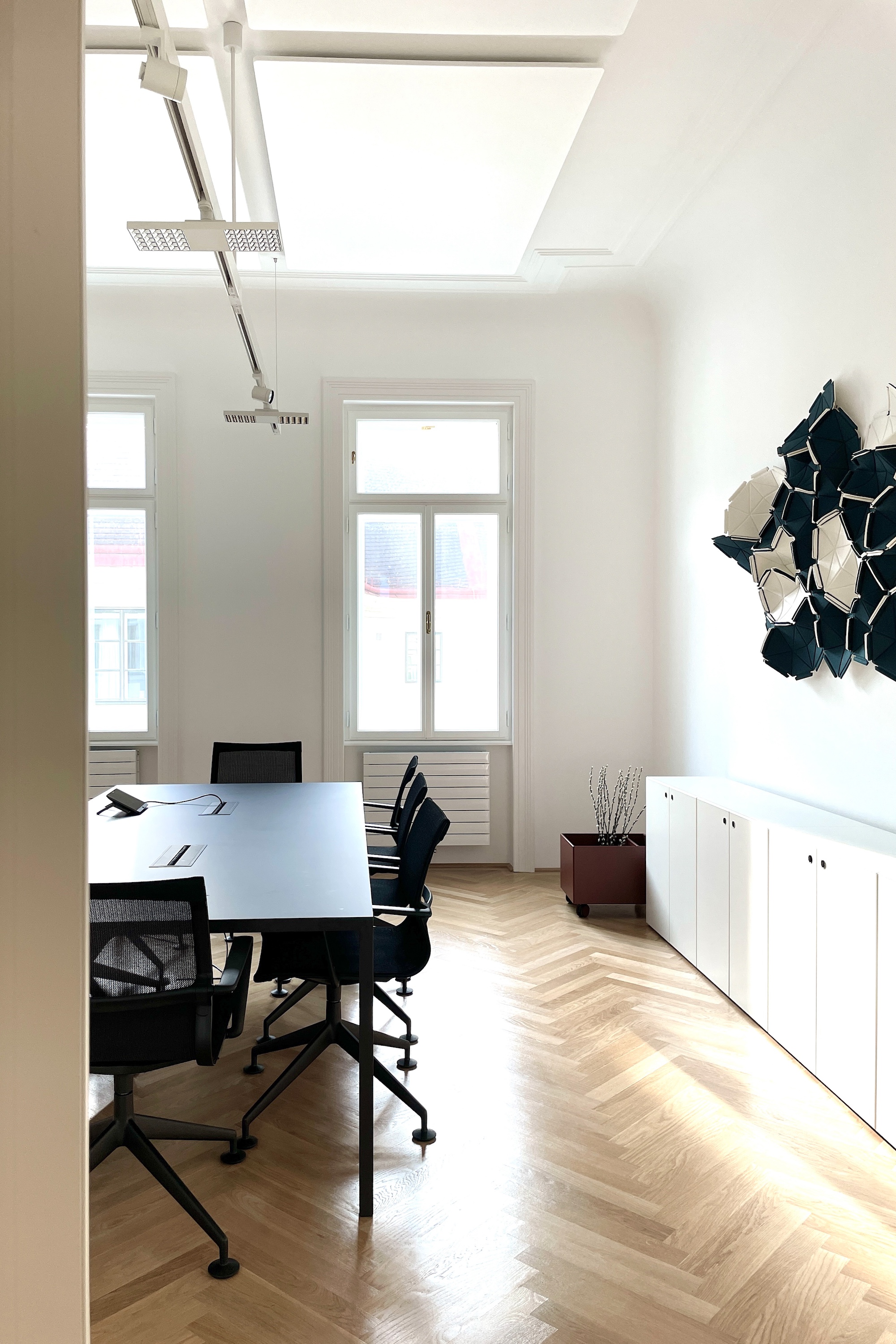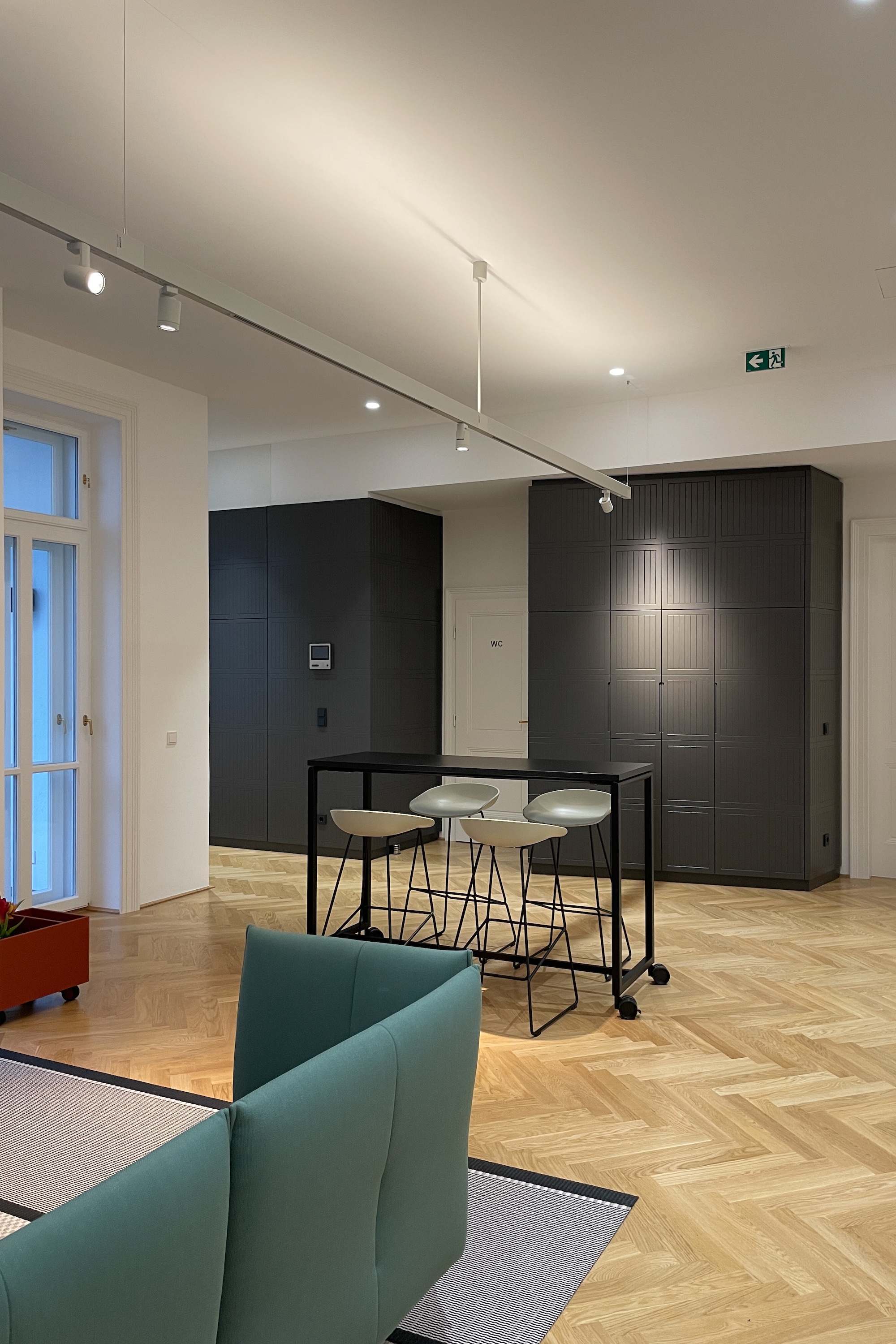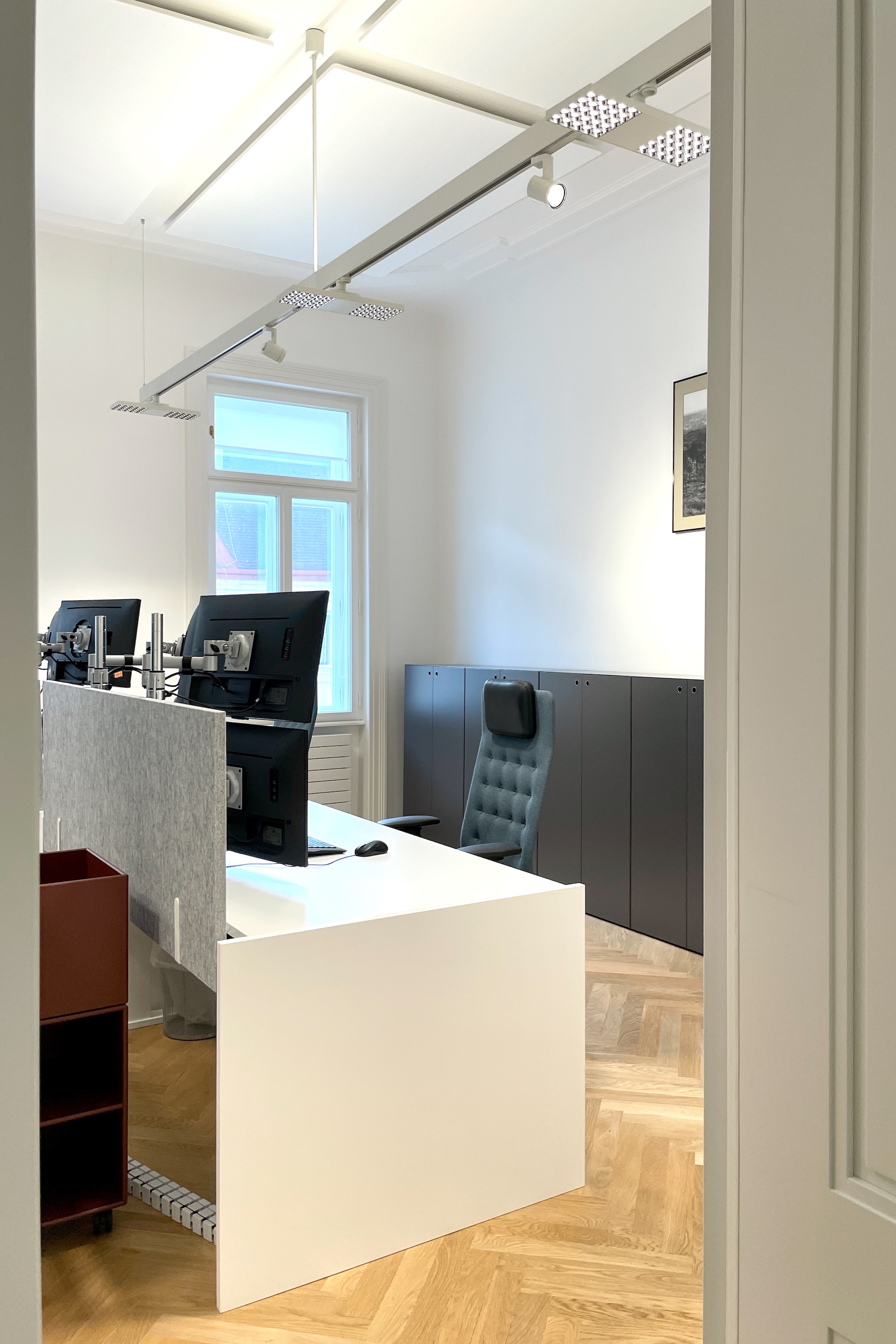 Die typische Struktur des Altbaus wurde von uns in ein offenes, modernes Bürokonzept transformiert. Zentraler Baustein ist ein einladender Empfangsbereich mit Wohnzimmercharakter, der Raum für Austausch und informelle Begegnungen schafft. Entlang der Wände führen maßgefertigte Einbauschränke in einem elegant pulverlackierten Grauton durch die Räume und sorgen für eine klare, ruhige Ordnung. Ihre fein strichlierte Oberfläche spielt subtil auf das Thema Energie und Solarpaneele an. Die Arbeitsplätze in den Einzelbüros sind mit höhenverstellbaren Tischen ausgestattet und bieten flexible Nutzungsmöglichkeiten. Für eine angenehme Akustik sorgen abgehängte, schallabsorbierende Deckenpaneele, ergänzt durch eine Wand-Cloud im Besprechungsraum. Ein besonderes Highlight ist der kleine Balkon mit Blick in den begrünten Innenhof – ein Rückzugsort, der vom Team sehr geschätzt wird und die Qualität des Arbeitsumfelds zusätzlich steigert.