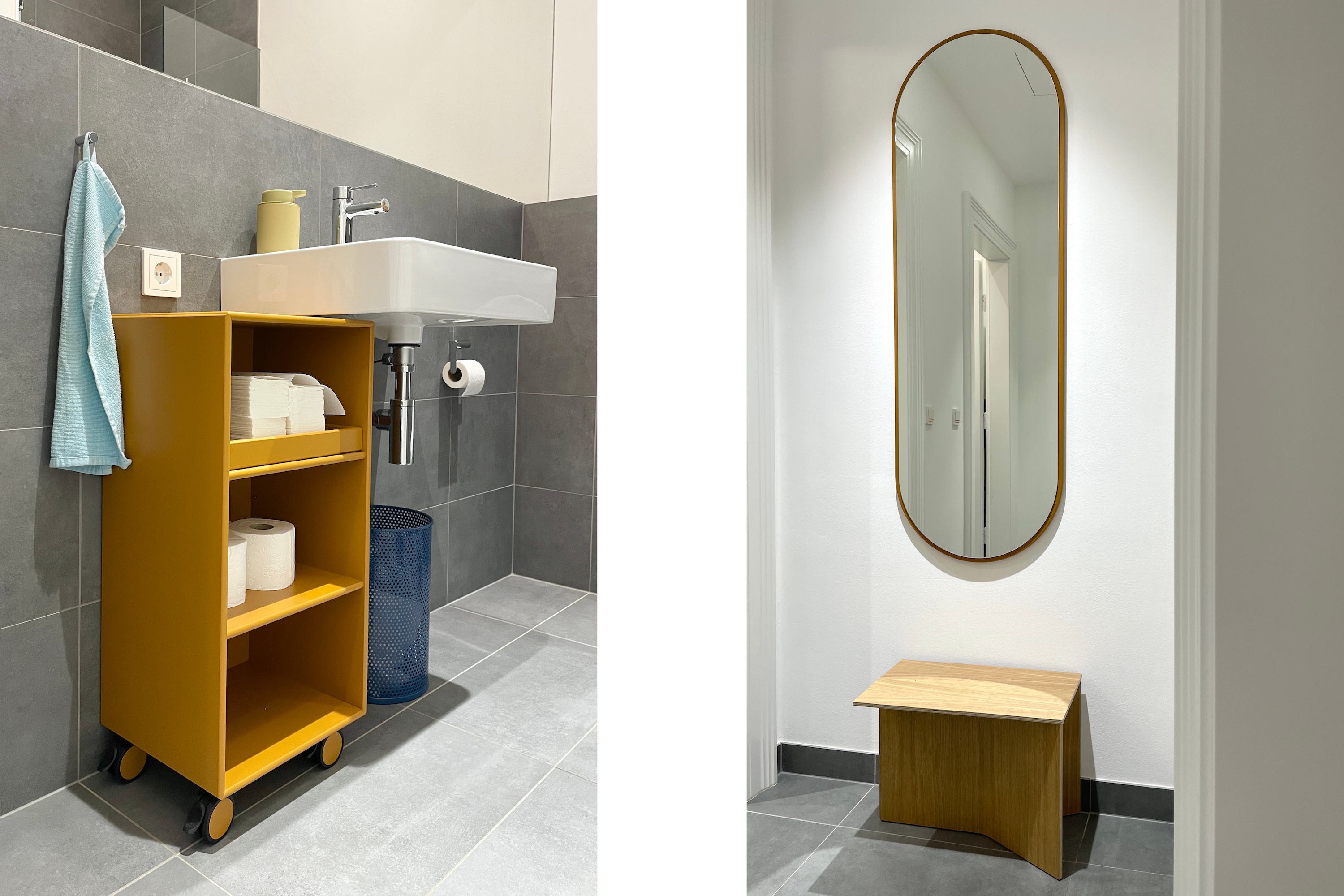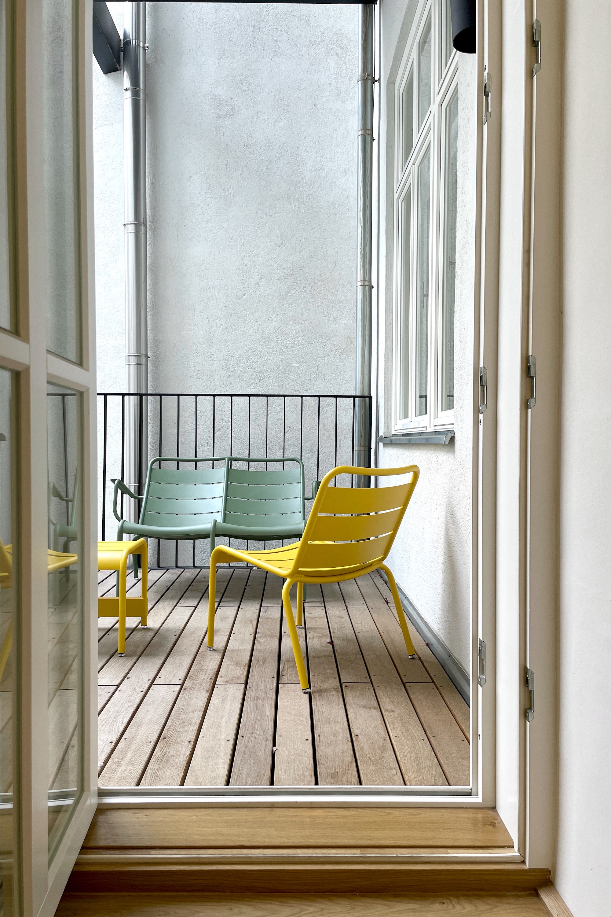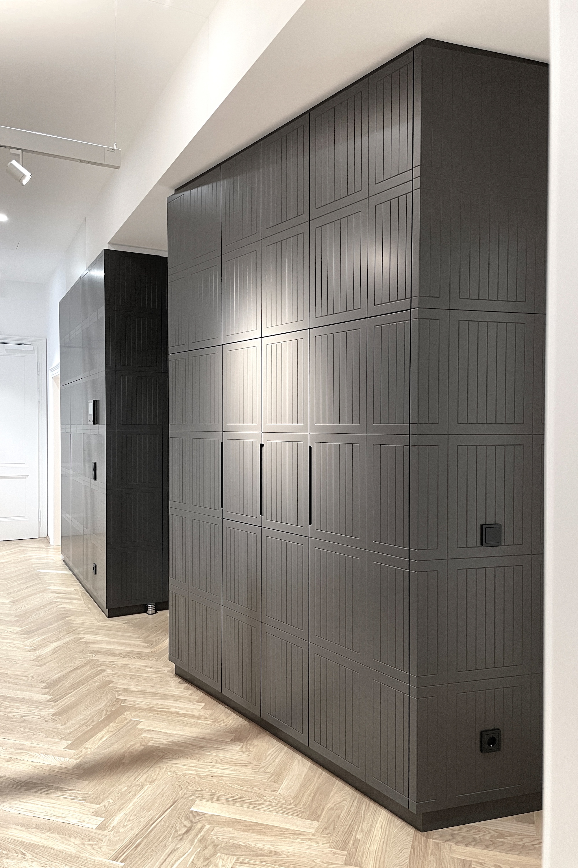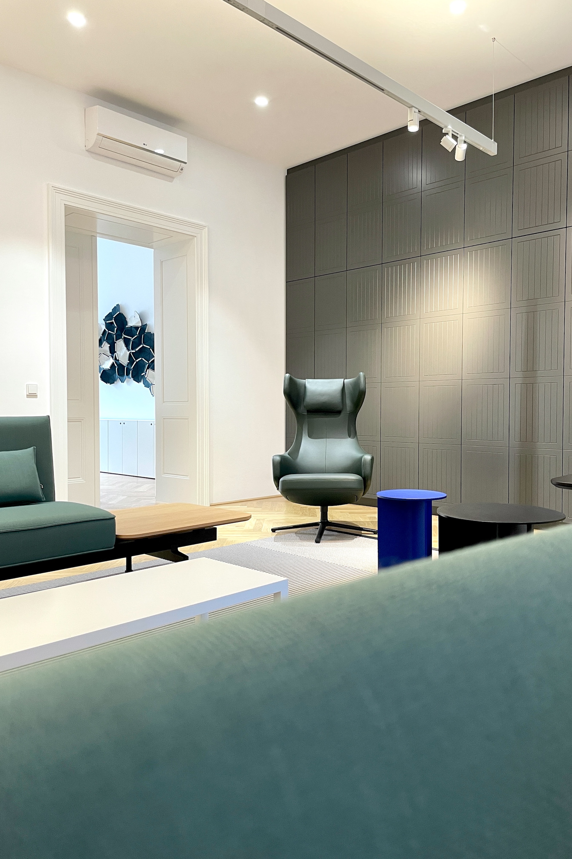 Die typische Struktur des Altbaus wurde von uns in ein offenes, modernes Bürokonzept transformiert. Zentraler Baustein ist ein einladender Empfangsbereich mit Wohnzimmercharakter, der Raum für Austausch und informelle Begegnungen schafft. Entlang der Wände führen maßgefertigte Einbauschränke in einem elegant pulverlackierten Grauton durch die Räume und sorgen für eine klare, ruhige Ordnung. Ihre fein strichlierte Oberfläche spielt subtil auf das Thema Energie und Solarpaneele an. Die Arbeitsplätze in den Einzelbüros sind mit höhenverstellbaren Tischen ausgestattet und bieten flexible Nutzungsmöglichkeiten. Für eine angenehme Akustik sorgen abgehängte, schallabsorbierende Deckenpaneele, ergänzt durch eine Wand-Cloud im Besprechungsraum. Ein besonderes Highlight ist der kleine Balkon mit Blick in den begrünten Innenhof – ein Rückzugsort, der vom Team sehr geschätzt wird und die Qualität des Arbeitsumfelds zusätzlich steigert.